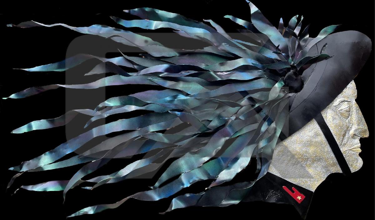 Nell’opera “Piume al Vento” del maestro Mazza è immediatamente riconoscibile il vigore dei Bersaglieri, specialità dell’Arma di Fanteria dell’Esercito Italiano. Con abile maestria, l’artista ha "piegato il ferro" e addolcito la lamiera, dando loro vita e colore, forgiando la ben nota “Vaira”, lunghe piume, sinuose e libere che volteggiano nel vento. Nel loro prolungarsi dal cappello del bersagliere, le piume del gallo cedrone risplendono di infiniti riflessi indaco, turchesi e smeraldo e ci ricordano la marcia tipica del soldato e sembra quasi di udire la tromba scandirne la corsa; mentre nello sguardo fiero, dritto davanti a sè, riconosciamo la consapevolezza e la responsabilità della chiamata alla quale risponde con impeto e abnegazione, correndole incontro.